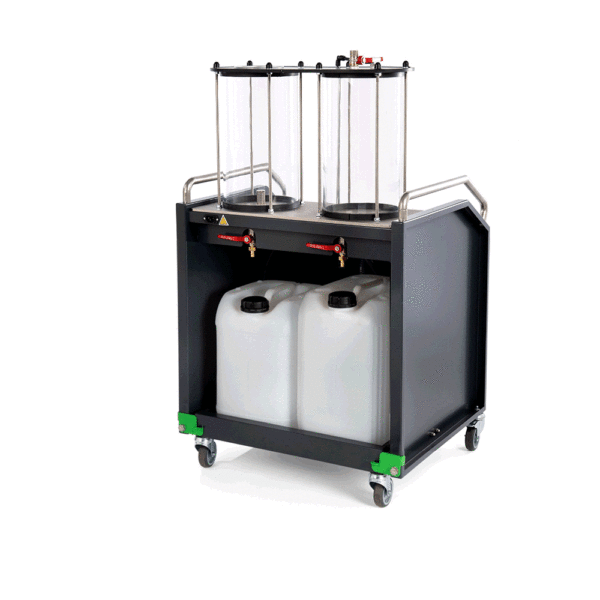 It is equipped with 2 buffer tanks of 10L each allowing infinite fluid draining.